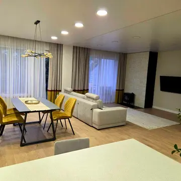 Будинок має 3 повнорозмірні спальні, 2 санвузли, гардероб та простору кухню-студію з виходом на терасу. Ремонт виконано за авторським проєктом. Опалення може здійснюватись газовим котлом (є теплі підлоги і радіатори), кондиціонером чи каміном. Система опалення індивідуальна газова. Є центральна каналізація, газ, центральний водопровід та свердловина. Автономність при блекауті забезпечується роботою опалення, інтернету та водопостачання. Встановлені лічильники. Квартира здається з меблями. Наявна побутова техніка: пральна машина, сушильна машина, електрочайник, холодильник, варильна панель, праска, мікрохвильова піч, духова шафа, пилосос, посудомийна машина. Домашніх улюбленців не допускають. Можлива оренда. Будинок розташований на закритій території котеджного містечка. Територія охороняється, є відеоспостереження, автоматичні ворота та паркінг (автонавіс). Поруч є асфальтована дорога, зупинки громадського транспорту, магазини та інші обєкти інфраструктури. До кожної спальні є свій балкон. Прально-сушильний блок винесено в окрему зону. Є вивід для зарядки електромобіля (10 кВт). Встановлено кондиціонер, камін, сигналізацію та підігрів підлоги. Є тераса.