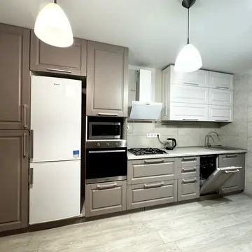 Квартира повністю укомплектована необхідною побутовою технікою, включаючи електрочайник, холодильник, варильну панель, мікрохвильову піч та пральну машину. Також є телевізор. Меблі присутні, зокрема меблі на кухні.