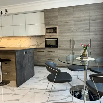 Квартира повністю укомплектована меблями та технікою. Є стильна вітальня з робочою зоною та зоною відпочинку, затишна спальня з якісним ортопедичним ліжком та вбудованими шафами, сучасна кухня з варильною поверхнею, духовою шафою, мікрохвильовою піччю, посудомийною машиною, електрочайником та холодильником. Також є скляний обідній стіл зі стільцями, пральна машина, телевізор, Wi-Fi.