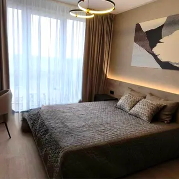 Квартира повністю мебльована. Є 2-х місне ліжко, меблі на кухні та гардероб. З побутової техніки є посудомийна машина, електрочайник, холодильник, варильна панель, мікрохвильова піч, духова шафа, плита, пральна машина, телевізор та кондиціонер.