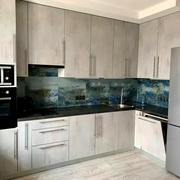 Меблі в ідеальному стані: кухонний гарнітур, обідній стіл зі стільцями; великий розкладний диван Blest, спальний гарнітур, обладнані відкритими шафами дві гардеробні.