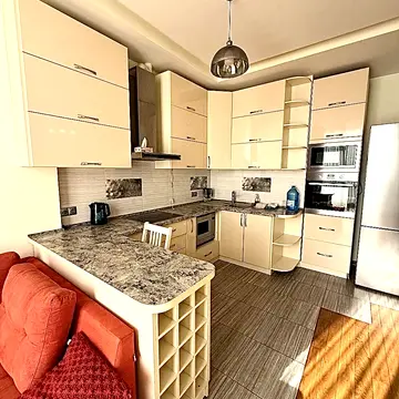 Квартира повністю укомплектована для комфортного проживання. Є два смарт телевізори, великий двокамерний холодильник з окремою морозильною камерою, духовка, посудомийна машина, кавомашина, пральна машина, сушильна машина, електрочайник, фен, варильна панель, праска, плита, пилосос. Також є меблі на кухні та гардероб.