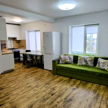 Квартира має планування типу студія, обєднану з кухнею, та дві окремі кімнати (спальня і дитяча). В квартирі виконано сучасний дорогий ремонт, ванна та туалет облицьовані плиткою. В квартирі є централізоване опалення, водопостачання та газ. Встановлені лічильники. Квартира укомплектована якісними меблями. Є двоярусне ліжко (підліткове), холодильник, мультиварка, плита, пилосос та пральна машина. Обговорюється можливість придбання ліжка або дивана в спальню в рахунок оренди. Квартира здається для сімї, можна з дітьми, або для дівчат студенток чи працюючих. Обовязкова умова – не курити в квартирі та на балконі. При поселенні оплачується перший місяць оренди, заставна сума та послуги агентства. Домашні улюбленці не допускаються. Будинок розташований у дворі з двома невеликими дитячими майданчиками. Зручна локація: поруч зупинки громадського транспорту, навпроти через дорогу знаходиться магазин АТБ. Квартира здається вперше. Є відеоогляд, який надається за запитом. Балкон засклений.