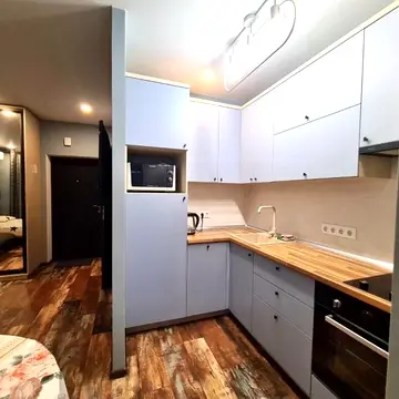 Квартира-студія з сучасним євроремонтом. Укомплектована всім необхідним: двоспальне ліжко, телевізор, кондиціонер, холодильник, мікрохвильова піч, духовка, посуд, пральна машина з сушкою, фен, праска. Квартира здається в посуточну оренду. Призначена для спокійного перебування, не для свят. Квартира розташована в ЖК бізнес-класу "Гранд Бурже", де є генератор для ліфта. Прямо з ЖК є вихід у ТРЦ "Авенір Плаза". Поблизу зупинка громадського транспорту, з якої можна доїхати до Києва. У ТРЦ "Авенір Плаза" знаходяться супермаркет "Сільпо", магазин "Єва", кавярні, ресторани, кінотеатр, спортзал та басейн.