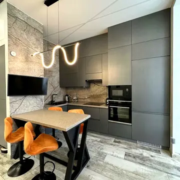 Квартира повністю мебльована. У спальні є двоспальне ліжко та містка гардеробна. У коридорі вбудована шафа та встановлений кондиціонер. Простора кухня дозволяє поставити диван та має зону для кабінету. Вбудована кухня оснащена посудомийною машиною, духовкою, варильною поверхнею, мікрохвильовою піччю та витяжкою. Встановлена дорога техніка Bosh, сантехніка Grohe та ванна Ravak.