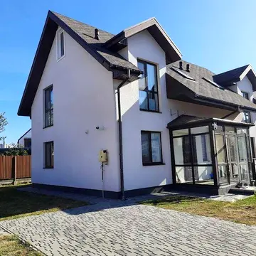 Будинок має два поверхи. На першому поверсі розташовані прихожа, санвузол, велика вітальня з кухнею (30 м²) з виходом на терасу та зоною відпочинку. На другому поверсі знаходяться дві окремі кімнати, санвузол та гардеробна. Третій поверх з вікном може бути облаштований як дитяча або господарська кімната з пральною машиною. Стан будинку - гарний, світлі білі кольори. Ремонт - авторський проект. Будинок обладнаний двома котлами: газовим та електричним. Водопостачання забезпечується свердловиною, а каналізація - септиком. Автономність при блекауті забезпечується роботою опалення, інтернету та водопостачання. Будинок продається з меблями та технікою. Наявна пральна машина, електрочайник, холодильник, варильна панель, мікрохвильова піч, духова шафа, плита, пилосос, посудомийна машина. Орендна плата становить 40000 гривень на місяць, додатково сплачуються комунальні послуги та страхова сума. Будинок розташований на сучасній вулиці. Є паркомісце на три машини. Територія огороджена. Поруч з будинком (500 м) розташовані супермаркети "Сільпо" та "Мегаполіс". Неподалік знаходиться ліс. Будинок має індивідуальне газове опалення. Санвузол: 2 і більше. Є ванна та душова кабіна. Мультимедіа включає швидкісний інтернет та Wi-Fi.