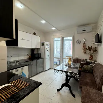 Квартира з кімнатою, розділеною на 2 зони: спальню та вітальню. Стіни оштукатурені з сіткою по всій квартирі, поклеєні шпалери, встановлені натяжні стелі. На підлозі постелений ламінат, а також тепла підлога. У квартирі встановлені кухня, душова кабіна, раковина з якісними кранами, унітаз. Квартира розташована в сучасному житловому комплексі. Встановлені хороші якісні двері, підвіконня, карнизи. Точкове світло, якісні світильники. З вікон відкривається вид на море.