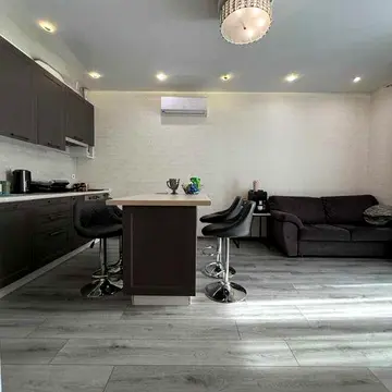 Квартира має планування кухня-студія з диваном та окрему спальню з двоспальним ліжком. Стан ремонту хороший. У квартирі є бойлер, смарт телевізор. В будинку є генератор на все, паркінг та укриття. Квартира обладнана вбудованою кухнею, островом, двома шафами, диваном, двоспальним ліжком, кондиціонерами, бойлером та смарт телевізором. Можливе проживання з котиком та маленьким песиком (до 10 кг). Новобудова з закритою територією, в будинку є паркінг і укриття. Працює генератор на все. Поруч розташовані ЖК Тайм, Олександрія. До метро Вокзальна до 15 хвилин пішки. Квартира має кухню-студію та окрему спальню. Є кондиціонери.
