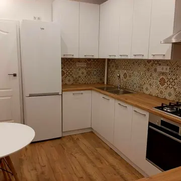 Квартира повністю мебльована. Є гардероб, шафи, меблі на кухні. Побутова техніка включає електрочайник, холодильник, фен, варильну панель, праску, мікрохвильову піч, духову шафу, плиту, пилосос, пральну машину. Є smart ТБ.