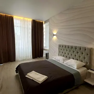 Квартира має формат кухні-студії, спальні, балкона та суміжного санвузла. Зроблено євроремонт.