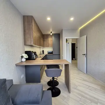Квартира розташована на першому (високому) поверсі з жилим цоколем знизу. Кімната облаштована комодом, шафою-купе, розкладним кріслом та ліжком-диваном з додатковим ортопедичним матрацом Футон, гіпоалергенними новими подушками та ковдрою. Також є барні крісла, телевізор, смарт-приставка ТВ, роутер, прасувальна дошка та сушарка для одягу. Кухня оснащена мікрохвильовою піччю, плитою, холодильником, електричним чайником, крапельною кавомашинкою, меблями та мінімальним посудом. Ванна кімната та коридор також облаштовані. Квартира світла та затишна.