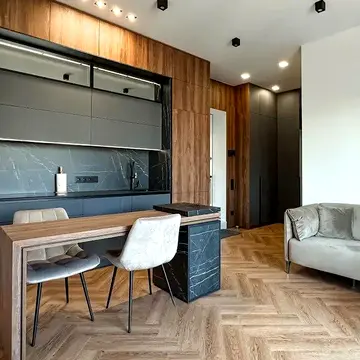 Вбудована кухня, шафа у вітальні та шафа у кімнаті, двоспальне ліжко, мякий шкіряний диванчик, трюмо.