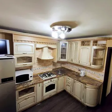 Квартира з меблями та технікою. Є меблі на кухні, електрочайник, холодильник, варильна панель, праска, мікрохвильова піч, духова шафа, плита, пилосос, пральна машина.