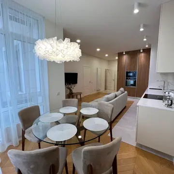 Квартира повністю мебльована італійськими меблями преміум-класу. Кухонна техніка від Keiser, пральна та сушильна машини Miele, винний шкаф, холодильник, варильна панель, мікрохвильова піч, духова шафа, посудомийна машина, електрочайник. Також є кондиціонери.