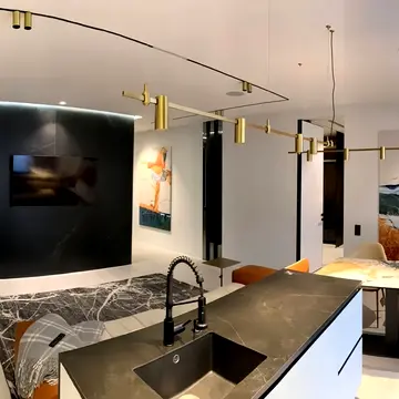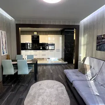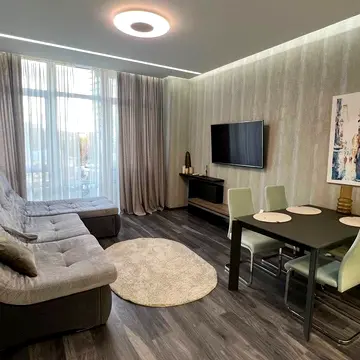Квартира повністю укомплектована меблями та технікою. Є стильна вітальня з робочою зоною та зоною відпочинку, затишна спальня з якісним ортопедичним ліжком та вбудованими шафами, сучасна кухня з варильною поверхнею, духовою шафою, мікрохвильовою піччю, посудомийною машиною, електрочайником та холодильником. Також є скляний обідній стіл зі стільцями, пральна машина, телевізор, Wi-Fi.