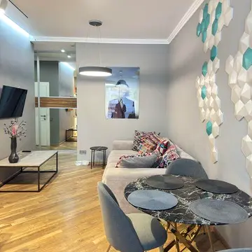 Апартаменти повністю мебльовані сучасною меблями. У затишній вітальні є зручний розкладний диван, розташований навпроти телевізора з плоским екраном, біля елегантного скляного столу. Дві спальні оснащені зручними ліжками розміру “king size”. Кухня повністю обладнана всіма необхідними приладами та технікою, включаючи посудомийну машину, електрочайник, холодильник, фен, варильну панель, праску, мікрохвильову піч, духовку, плиту, пилосос та пральну машину.
