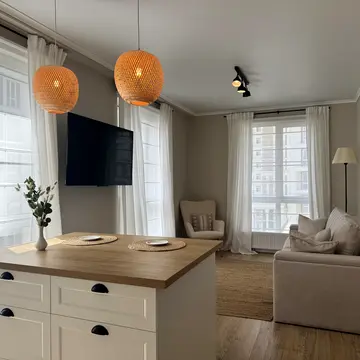 Квартира повністю мебльована та обладнана побутовою технікою. Є велика кількість місць для зберігання, включаючи кухню до стелі, шафи, вітрину, ліжко та диван з нішами. Вбудована техніка від Whirlpool, Samsung, Franke включає холодильник, посудомийну машину, плиту, духовку та витяжку. Також є кондиціонер, телевізор, електрочайник, праска, мікрохвильова піч, пилосос та пральна машина.