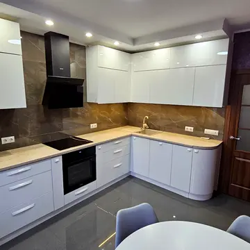 Вбудована кухня з повним комплектом техніки, зручні робочі поверхні, продумане зонування.