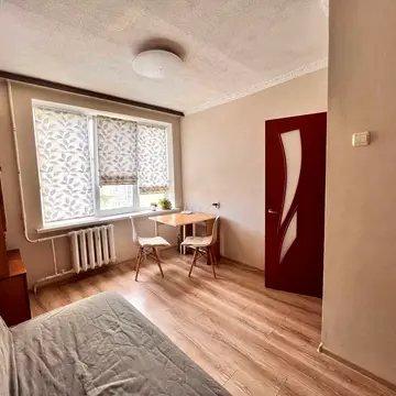 Квартира має роздільне планування та знаходиться в житловому стані. Кімната площею 14,9 м.кв. оснащена двоспальним диваном, шафою, офісним столом та стільцем. Балкон засклений. У коридорі є міні-стінка та Wi-Fi роутер. Санвузол суміжний, облицьований плиткою, з ванною та бойлером.