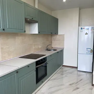 Комплектація квартири меблями та технікою: кутова кухня, варильна поверхня, духова шафа, витяжка, холодильник, пральна машина, двоспальне ліжко, диван, шафи, душова кабіна.