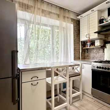 2-кімнатна квартира на Русанівці, цегляний будинок, дуже зручний 2 поверх, поверхом нижче -нежитлові приміщення банку. Кімнати суміжно-роздільні, площею 18 кв. м та 10 кв. м; кухня 6 кв. м, коридор 5 кв. м, роздільний санвузол. Квартира підключена до централізованої охорони. Незадовго до початку війни в квартирі зроблено капітальний ремонт, замінено електропроводку, сантехніку, лічильники води, кухню, металопластикові вікна. Квартира обладнана всім необхідним для життя - великий розкладний кутовий диван, софа (спальне місце 120х190 см), шафи, стільці, крісло, стіл, приміщення гардеробної, пральна машинка, холодильник, бойлер, газова плита, духовка, інтернет. Є піаніно для занять музикою. Достатньо місця для розміщення письмового столу або дитячого ліжечка. Вікна виходять у тихий двір. Без балкону. В будинку є підземне укриття. Поруч зупинка автобуса №48 до м. Лівобережна. За 10 хвилин пішки - зупинка інших автобусів, тролейбусів та станція міської електрички «Русанівка».