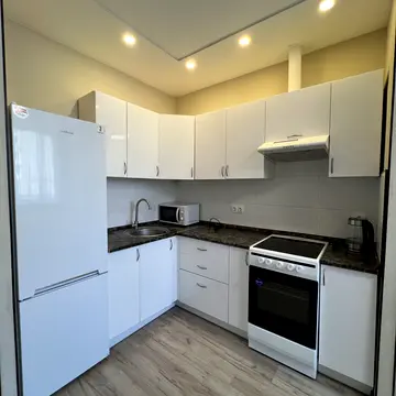 Квартира повністю мебльована та обладнана необхідною технікою для комфортного життя. Є великий розкладний диван, кондиціонер, столик, пральна машина, бойлер, електрична рушникосушка, холодильник, варильна панель, мікрохвильова піч, духова шафа.
