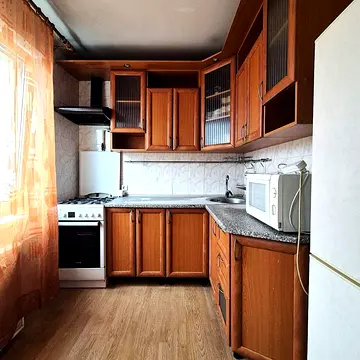 Квартира в житловому стані, з роздільним плануванням. 3 окремі житлові кімнати: 17,2; 14,7; 10,1 м.кв. з спальними місцями та шафами, встановлені металопластикові склопакети. Середня з кімнат із заскленим балконом. Кухня 9,2 м.кв, з вбудованими меблями і технікою, холодильником, кухонним кутком. Роздільний санвузол із ваною, заміненим стояком, в плитці. Коридор 11 м.кв..