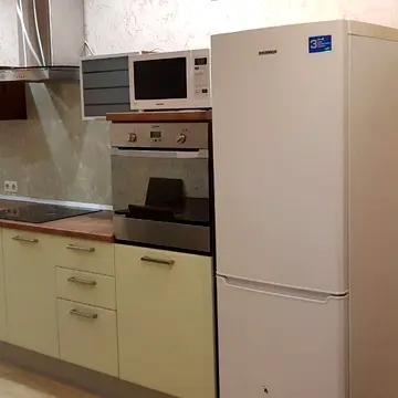 Кухня, велика, але ж не пристосована до великих можливостей для приготуванню їжі, немає витяжки і духової шафи, але ж є великий холодильник, ел.плита