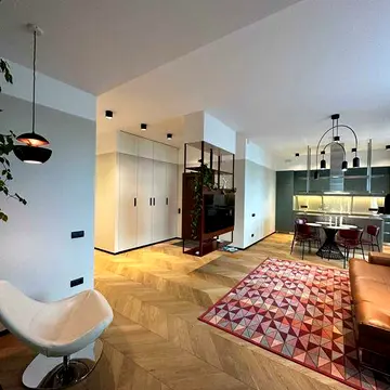 Квартира має роздільне планування та виконана за авторським проектом. Простора вітальня-кухня площею понад 45 кв.м. включає спальню з гардеробною кімнатою, сучасну дитячу кімнату зі спортивним куточком та робочою зоною для школярика. Облаштована окрема ванна кімната та другий санвузол з тропічним душем. Є дві відкриті тераси з вуличними меблями й освітленням. Квартира має централізоване опалення. Будинок обладнано сонячними панелями та інверторами, що забезпечує функціонування ліфтів та інженерних систем у будь-який час. Автономність при блекауті: підключене резервне живлення, працює ліфт, працює опалення, працює інтернет, працює водопостачання. Квартира повністю мебльована та обладнана побутовою технікою, включаючи кавомашину, посудомийну машину, сушильну машину, електрочайник, холодильник, варильну панель, мікрохвильову піч, духову шафу, пилосос, пральну машину. Є два холодильники та LG OLED Smart TV. Перша здача. Комісійна винагорода становить 50%%. Житловий фонд 2011-2020-х років. Панорамний поверх дарує види на 270°. Будинок має статусність і комфорт клубного формату: тиха дипломатична вулиця, доглянутий фасад, тераса на даху з коворкінгом і лаунж-зоною. Підземний паркінг/укриття з прямим доступом ліфтом — без жодного порога чи сходинки, зручно навіть з дитячою коляскою. Будинок обладнано відеоспостереженням, пожежною сигналізацією, охороною території. Є консьєрж, ліфт, гостьовий паркінг. Квартира розташована на тихій дипломатичній вулиці. Квартира має вражаючий кінематографічний дизайн, створений командою архітекторів з багатьма нагородами, ідеальна ергономіка. Інтер’єр створений відомою архітектурною студією й наповнений дизайнерськими об’єктами середини 60–70-х років: італійські меблі на замовлення, культове данське та французьке освітлення (GUBI, Anglepoise), натуральне дерево на підлозі, тосканська шкіра, terrazzo, алюмінієві системи і бібліотека Rimadesio. Багато знакових предметів інтер’єру, які ми впізнаємо з кіно. У просторі використано дорогі тканини та фурнітуру, дубовий паркет на підлозі у всій квартирі, фасади й стільниця з нержавійки, terazzo у санвузлах. Для оздоблення застосовані переважно нішеві матеріали: фарби англійської мануфактури Little Greene, чеські склоблоки Bohemia та інші преміальні елементи. Квартира створена для тих, хто цінує естетику та архітектуру. Інтерєр вражає та заворожує з порогу.