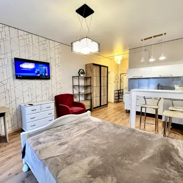 Квартира має роздільне планування та виконаний євроремонт. Вона укомплектована меблями, включаючи зручне двоспальне ліжко та диван.