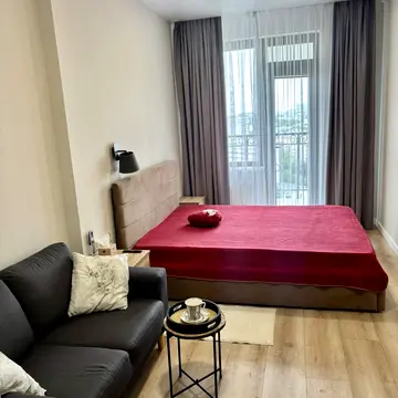 Квартира повністю мебльована. Є чайник, кавоварка, кондиціонер, пральна та сушильна машина, духовка, холодильник, пилосос та праска.