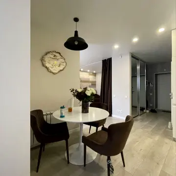 Інтер’єр повністю укомплектований: величезний шафа-купе у коридорі, окремі шафи у кожній кімнаті, великий шкіряний кутовий диван у вітальні, додатковий диван для відпочинку у спальні, вбудована кухня та обідня група, туалетний столик.