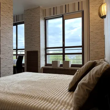 Квартира має великий балкон та лоджію, панорамні вікна, кондиціонер, систему сигналізації та гардероб. Грати на вікнах забезпечують додаткову безпеку.