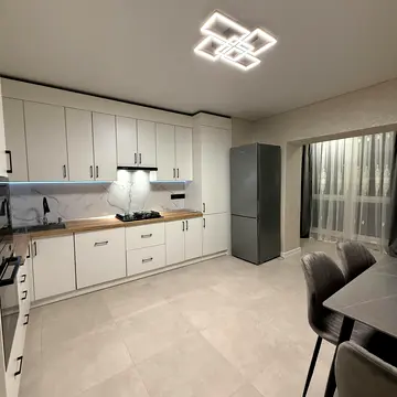 Обладнана новими, вбудованими меблями та сучасною технікою. Обідня зона з круглим столом і стильними стільцями.