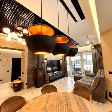 Просторий дворівневий будинок площею 102 м² спроектований з акцентом на світло та комфорт: високі стелі (3,70 м та 2,70 м), панорамне скління та тепла підлога по всьому будинку створюють особливу атмосферу затишку.