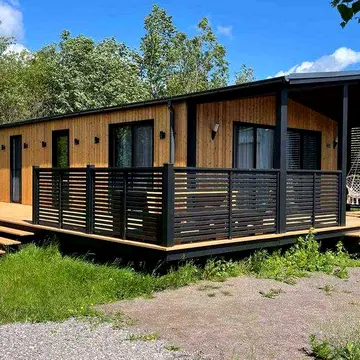 Будинок має повну комплектацію "під ключ". Встановлені міжкімнатні двері, на підлозі - ламінат. Виконано розведення електрики та водопроводу. Меблі та техніка не включені у вартість. Термін виробництва складає 3-4 місяці. Будь-які характеристики, матеріали чи планування можна змінити або покращити під ваші потреби. Будинок є енергоефективним і підходить для постійного проживання. Каркас виготовлений з каліброваного бруса камерної сушки з вогне-біозахисним обробленням. Утеплення виконано базальтовою ватою: стіни - 150 мм, підлога та стеля - 200 мм (зимовий варіант). Зовнішнє оздоблення виконано планкеном із захисно-декоративним покриттям. Внутрішнє оздоблення виконано імітацією бруса та вагонкою, покритими захисним складом. Вікна та двері металопластикові з ламінацією (чорний колір), енергоефективний 2-камерний склопакет. Компанія "Сучасні Модульні Будинки" надає повний сервіс: від проектування до доставки та монтажу на вашій ділянці.
