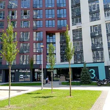 Велика прибудинкова територія має паркову зону з місцями для відпочинку, дитячими ігровими майданчиками та вело доріжками без активної проїжджої частини.